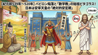 日本と欧州の歴史まとめ 【紀元前539年〜520年】バビロン陥落と「数学教」の始祖ピタゴラス! 日本は安寧天皇の「絶対的安定期」